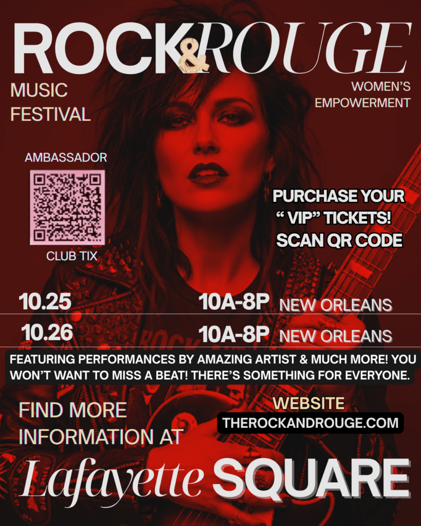 New Orleans, LA — Rock and Rouge Foundation proudly announces the return of its FREE annual Women’s Music & Food Festival, a vibrant celebration of women’s empowerment, creativity, and community, taking place October 25–26 in Lafayette Square, located in the heart of the New Orleans Central Business District (CBD) on 500 Saint Charles Avenue.